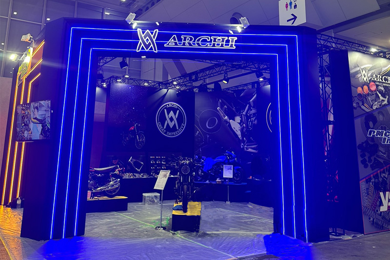ブルーライトが彩るゲートの奥には2023年コンセプトモデルの「ブルーサテライト」とカスタムパーツを展示。本邦初公開「漆黒メッキシリーズ」を纏うマシンはARCHIの新たな挑戦でもあります。右手には2022年コンセプトモデルをベースに新たな価値を提案する「レッドジュエル」を展示。更なる進化をご覧いただけます!