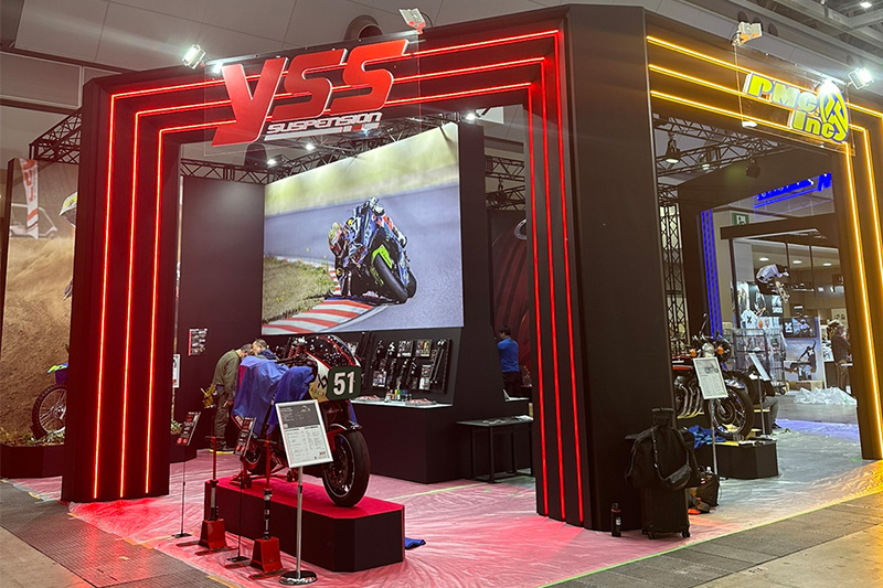 レッドライトが彩るゲートの正面を飾るのはT.O.T.ストリートファイター部門で栄光を勝ち取ったYSS ARCHI Racing。サーキットでも勝てる本格派マシンの横では特に高速域での挙動安定に欠かせないサスペンションの効果が実感できる体感機をご準備。また、オフロードジャンルへの挑戦としてKLX230コンセプトモデルを展示中!